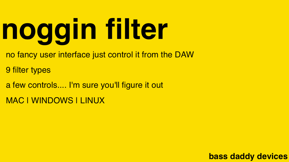 Noggin is Bass Daddy's gift to you this Christmas - a powerful multi filter that lost its head somewhere between the studio and the chimney. No GUI, no fuss, just pure filtering goodness controlled straight from your DAW.